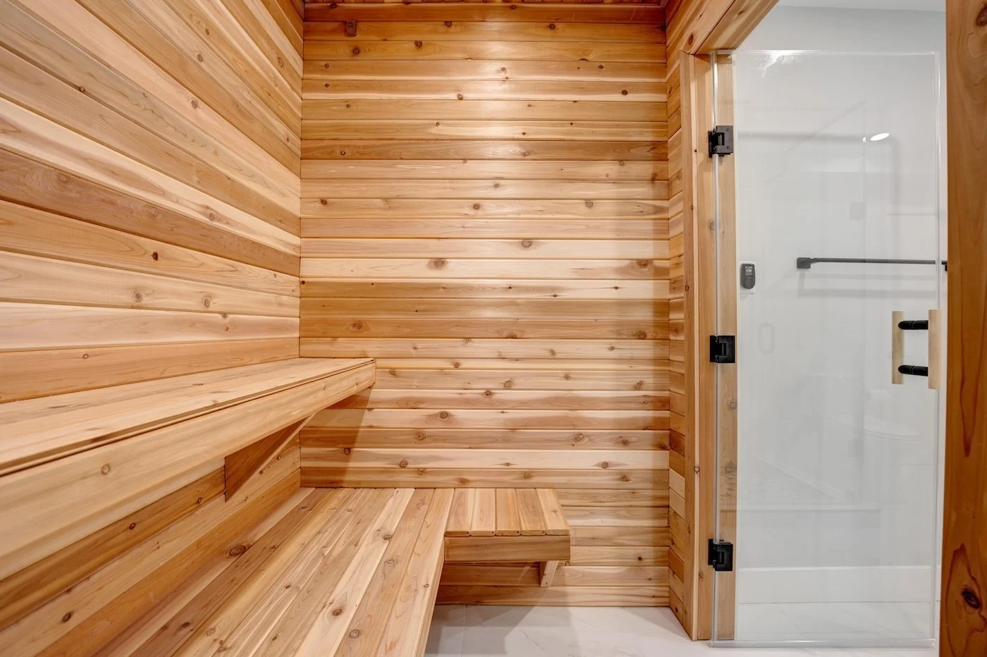 Every element of this space was chosen to create a balanced sensory experience from the warm cedar tones to the smooth transition between the sauna, shower, and bathroom zones.