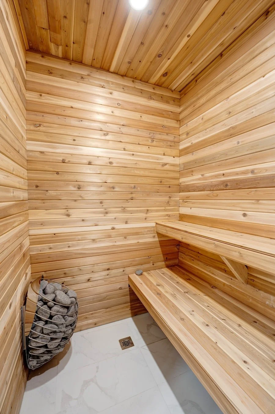 After Pictures of Custom built-in Basement Sauna + Bathroom remodel